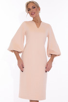 Стильное платье прямого силуэта, выполнено из струящейся ткани с благородным матовым блеском. Округлый вырез горловины. Рукава длинные втачные. Внизу обработан высокий разрез с кружевной отделкой. Застёжка по спинке в среднем шве «капля» на пуговицу и навесную петлю.