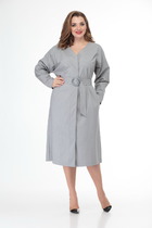 Легкое платье прямого силуэта. Округлая горловина на внутренней обтачке. Короткие цельнокроеные рукава, оканчиваются манжетами на отворотах. В среднем шве спинки расположен разрез с застежкой на пуговицу. Пояс из основного материала в комплекте. Низ ровный, без разрезов.