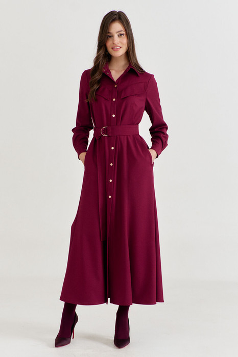 Платье свободного кроя, длиной до щиколотки, расширенное к низу. По спинке кокетка и рельефы. От кокетки по спинке заложена бантовая складка по центру. По переду кокетка и рельефы. В шов притачивания кокетки вставлены клапана. В боковых швах обработаны карманы. Рукава одношовные, втачные, длинные. По низу рукава обработаны складки, разрез и притачная манжета. По манжете застежка на кнопки. По переду застежка на кнопки на притачной планке. По горловине воротник рубашечного типа на отрезной стойке. Платье дополняет съемный пояс.