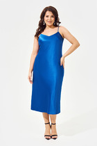 Платье женское относится к нарядной торжественной одежде. Платье полуприлегающего силуэта, с отлетной накидкой длиной за колено. Перед с двумя нагрудными вытачками, с двумя талиевыми вытачками. Спинка с двумя талиевыми вытачками и средним швом, заканчивающимся шлицей. Застежка на потайную тесьму-молнию в среднем шве спинки. Горловина круглая, обтачная, без воротника, по горловине закреплена накидка. Слева на уровне линии талии отделочным хлястиком, декорированным тесьмой накидка закрепляется на платье, нижняя часть накидки закреплена в левом боковом шве. Накидка с фигурным низом. Платье без рукавов. Длина спинки 103 см. Длина накидки от горловины 38 см