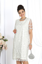 Платье женское прямого силуэта, длиной за колено. Перед с 2-мя нагрудными выточками, с отделочным защипом шириной 0,6 см по центру, с одним накладным прямоугольным карманом на уровне линии бёдер справа. Карман декорирован 2-мя надстрочными аппликациями. Спинка цельнокроеная, декорирована надстрочной отделочной тесьмой. Горловина круглая с втачной планкой. Платье со спущенным плечом. Рукав втачной, одношовный, с декорированным вертикальным защипом по центру шириной 0,6 см. платье без плечевых накладок. Длина спинки 100 см, длина рукава 50 см, от горловины 61 см.