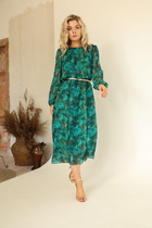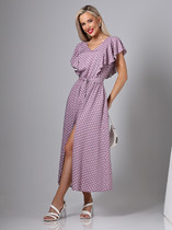 Платье для повседневной носки. Платье женское расширенное к низу, длиной за колено. Перед с 2-мя нагрудными вытачками с фигурным подрезом о линии талии до линии бёдер, в швах соединения подрезов обработаны карманы, собранные на эластичную тесьму. Перед с 2-мя приточными вертикальными планками по центру. Спинка с горизонтальным подрезом на уровне линии бёдер, верхний срез нижней части подреза со сборкой. Горловина круглая с втачной стойкой. Застёжка центральная на 5-тьобмётанных петель и 5-тьприштыных пуговиц. Рукав втачной, 2-х шовный, короткий. Верхний шов рукава с разрезом, низ с приточной манжетой, переходящей в завязки. Платье с плечевыми накладками. Длина спинки 109 см, длина рукава 22 см.