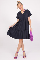 Платье женское предназначено для повседневной носки. Платье женское прямого силуэта, длиной за колено. Перед и спинка цельнокроеные. Горловина круглая с втачной планкой из отделочной ткани. Правый плечевой шов с настрочным погоном из отделочной ткани, декорированным 3-мя пришивными пуговицами. Платье со спущенным плечом. Рукав втачной, одно шовный, длинный с притачной манжетой из отделочной ткани. Низ платья с притачной планкой из отделочной ткани. Платье на подкладке. Платье без плечевых накладок. Длина спинки платья 103,5 см. Длина рукава 47 см, длина рукава от горловины 67 см.