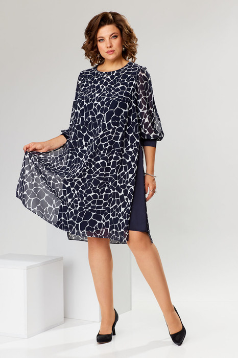 Платье женское, относится к коктейльным платьям. Платье женское, А-силуэта, длиной за колено. Перед с 2-мя нагрудными вытачками, выходящими из проймы. Спинка вверху по горловине с обтачным разрезом, фиксирующимся на 1-ну навесную петлю и 1-ну пришивную пуговицу. Горловина круглая, обтачная, без воротника. Боковые швы с очень высокими разрезами. Рукав втачной, двух шовный, длиной 7/8, с притачной манжетой из отделочной ткани, частично собранной на эластичную тесьму; верхний шов с высоким разрезом. По окату рукава и низу рукава лёгкая сборка. Платье на подкладке из текстильной отделочной ткани. Платье без плечевых накладок. Длина спинки платья 100 см, Длина рукава 50 см.