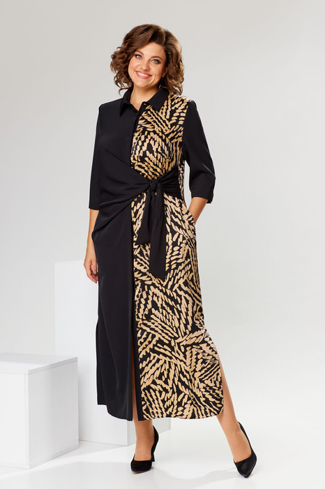 Платье женское предназначено для повседневной носки. Платье женское полу прилегающего силуэта, длиной до нижней части икры. Правая часть переда с конструктивным подрезом, формирующим запах, с притачным поясом; левая часть переда из отделочной ткани с 1-ной нагрудной вытачкой и притачной вертикальной планкой. Спинка со средним швом, 2-мя таллиевыми вытачками, левая часть спинки из отделочной ткани. Боковые швы с карманами, внизу с разрезами в левом боковом шве закреплён пояс. Горловина круглая с втачным воротником рубашечного типа с отрезной стойкой. Застёжка центральная потайная на 8-мь вертикально обмётанных петель и 8-мь пришивных пуговиц. Рукав втачной 2-х шовный, длиной 3/4, локтевой шов с разрезом. Платье с плечевыми накладками. Длина спинки платья 131 см, длина рукава 43 см.