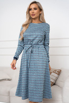 Платье женское предназначено для повседневной носки. Платье женское прямого силуэта, длиной за колено. Перед со средним швом, с 2-мя нагрудными вытачками, с 2-мя накладными с закруглёнными концами карманами на уровне линии бёдер, левый декорирован пришивным украшением. Спинка со средним швом. Застёжка на металлическую втачную молнию в среднем шве спинки. Горловина круглая, обтачная без воротника. Платье со спущенным плечом. Рукав втачной, одно шовный, длиной 7/8. Низ рукава декорирован металлической кнопкой, фиксирующей одностороннюю складкой. Платье без плечевых накладок. Длина спинки платья 106 см, длина рукава 43 см.