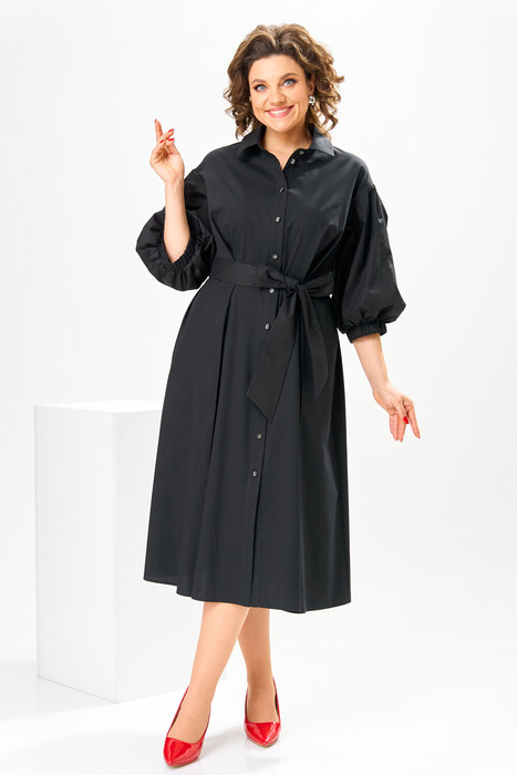 Платье женское, коктейльное. Платье женское, отрезное по линии талии, расширенное к низу, длиной до середины икры. Перед с 2-мя притачными вертикальными планками, верхняя часть с 2-мя односторонними складками по линии талии, нижняя часть переда с 2-мя зафиксированными односторонними складками. Верхняя часть спинки со средним швом и 2-мя односторонними складками по линии талии, нижняя часть так же со средним швом и 2-мя закреплёнными односторонними складками. Горловина круглая с втачным воротником рубашечного типа с отрезной стойкой, верхний воротник из отделочной ткани. Застёжка центральная на 11-ть вертикально обмётанных петель и 11-ть пришивных пуговиц. В боковых швах обработаны карманы. Платье со спущенным плечом. Рукав втачной, одно шовный, длиной 3/4. Окат рукава с 6-ю односторонними складками, низ со сборкой и притачной манжетой собранной на эластичную тесьму. Рукав и манжета из отделочной ткани. К платью прилагается съёмный пояс. Длина спинки 16 см, длина рукава 42,5 см.