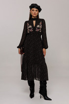 Платье женское относится к нарядной торжественной одежде, но может использовано и при повседневной носке. Платье женское, отрезное по линии талии, расширенное к низу, длиной за колено. Верхняя часть переда с отрезными рельефами, выходящими из плечевых швов, центральная часть с зафиксированным запахом. Верхняя часть спинки со средним швом и 2-мя рельефами, выходящими из плечевых швов. Горловина с V-образным вырезом, фигурная, обточная без воротника. Нижняя часть переда и нижняя часть спинки цельнокроеные, выполнены из отделочной ткани. Шов соединения верхней и нижней частей платья декорирован притачной фигурной отлетной баской. Платье с декоративным поясом из отделочной ткани, закреплённом на левом боковом шве и фиксирующимся в бант через металлическую пробивную блочку на центральной части переда. Рукав одно шовный втачной, длиной до локтя, с притачной фигурной манжетой. Платье с плечевыми накладками. Нижняя часть на подкладке. Длина платья 112 см, длина рукава 33 см.