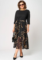 Платье женское относится к нарядной торжественной одежде, но может использовано и при повседневной носке. Платье женское, отрезное по линии талии, расширенное к низу, длиной за колено. Верхняя часть переда с отрезными рельефами, выходящими из плечевых швов, центральная часть с зафиксированным запахом. Верхняя часть спинки со средним швом и 2-мя рельефами, выходящими из плечевых швов. Горловина с V-образным вырезом, фигурная, обточная без воротника. Нижняя часть переда и нижняя часть спинки цельнокроеные, выполнены из отделочной ткани. Шов соединения верхней и нижней частей платья декорирован притачной фигурной отлетной баской. Платье с декоративным поясом из отделочной ткани, закреплённом на левом боковом шве и фиксирующимся в бант через металлическую пробивную блочку на центральной части переда. Рукав одно шовный втачной, длиной до локтя, с притачной фигурной манжетой. Платье с плечевыми накладками. Нижняя часть на подкладке. Длина платья 112 см, длина рукава 33 см.