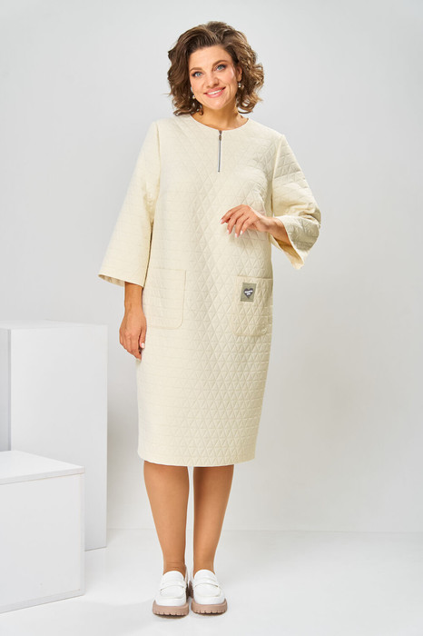 Платье женское, предназначено для повседневной носки. Платье женское, прямого силуэта, свободного кроя, длиной ниже колена. Перед с 2-мя нагрудными выточками, с 2-мя накладными карманами на уровне линии бёдер, левый с настрочной аппликацией. Спинка со средним швом, заканчивающийся разрезом. Горловина круглая, обточная, без воротника, по переду с разрезом, с вточной металлической молнией. рукав вточной, одно шовный, длиной 7/8. Платье без плечевых накладок. Длина спинки 100 см, длина рукава 49 см.