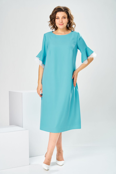 Платье женское, коктейльное. Платье женское, А-силуэта, длиной до середины икры. Перед с 2-мя нагрудными вытачками, выходящими из пройм. Спинка с 2-мя таллиевыми выточками и  средним швом. Горловина круглая, обточная, без воротника. Рукав втачной, одно шовный, с притачным двойным воланом, нижний из отделочной ткани с притачным кружевом, рукав длиной до локтя. Платье на подкладке. Платье с плечевыми накладками. Длина спинки 111 см, длина рукава 30 см.