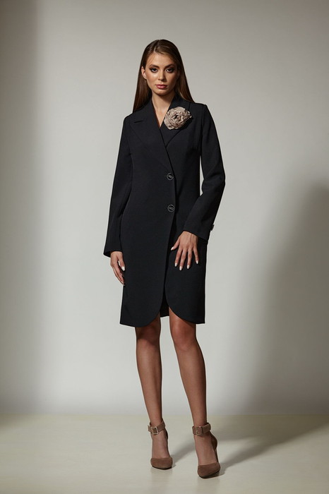 Двубортное платье из костюмной ткани на подкладке. По переду платья - нагрудные вытачки, по спинке - рельефы. Бочки, смещенные к переду, делают удобным расположение карманов в швах. Воротник - отложными лацканами пиджачного типа. Рукава - двухшовные, длинные, со шлицей и 2 пуговицами. Жакет застегивается на 2 основные пуговицы, 1 потайную.  Платье украшает цветок ручной работы.