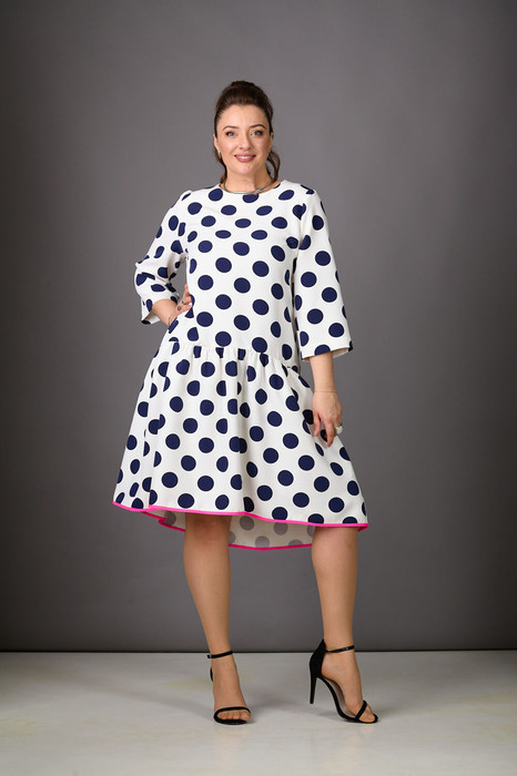 Ах, какая находка - платье в эффектные горохи! Невероятно красивое, комфортное платье станет вашим пропуском в лето! Роскошное платье трапециевидного силуэта из плательной ткани. Сочные горохи, разница в длине между передом и спинкой, яркая полоса по низу делают платье неповторимым. Нижняя присборенная часть платья добавит легкости. Рукава втачные, трехчетвертные. По спинке - средний шов, молния. Cкрасьте момент с Rosheli!