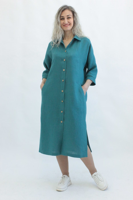 Платье-рубашка свободного кроя с воротником на стойке. Рукав цельнокроенный Вѕ с притачной манжетой. В рельефных швах переда карманы. Застёжка на петлю, пуговицу. По бокам разрезы. Длина изделия 114 см.