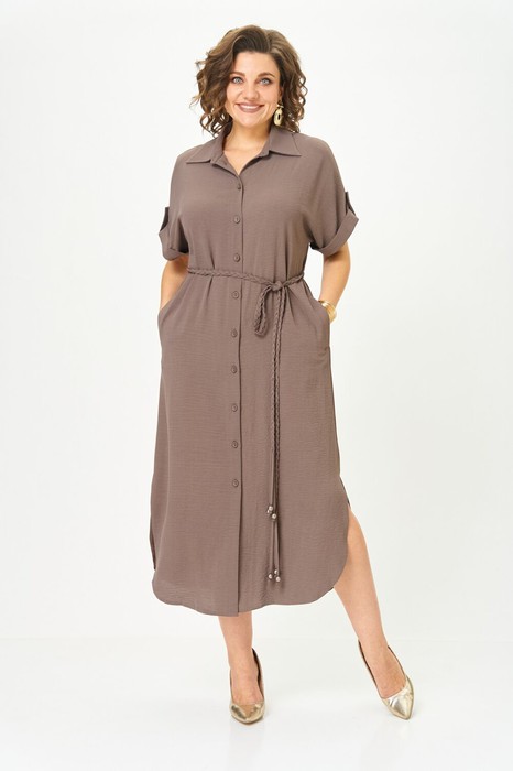 Платье женское прямого силуэта со спущенной линией плеча. Застежка центральная на 8 петель и пуговиц. Воротник отложной на стойке. По верхней части спинки кокетка, нижняя часть спинки со встречной складкой. В боковых швах карманы. По линии талии пояс в тон ткани. Низ рукава с манжетой и декоративной патой. Платье с фигурной линией низа и разрезами.