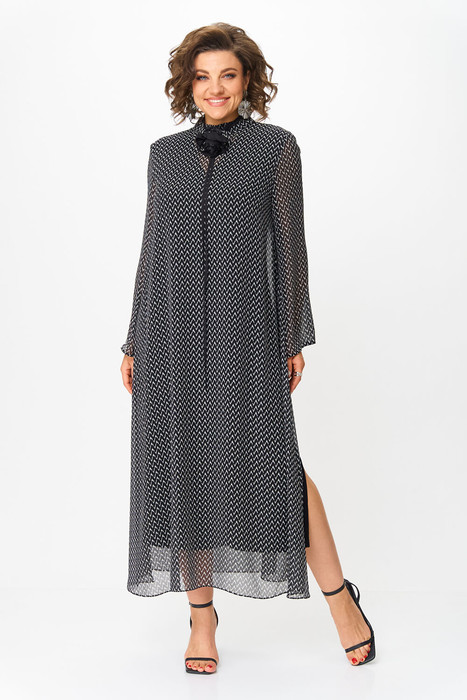 Верхнее платье из шифона свободного кроя расширено к низу, с втачным рукавом. По горловине воротник стойка с застежкой по спинке на две воздушные петли и пуговицы. Рукав длинный расширенный к низу. В боковых швах высокие разрезы.