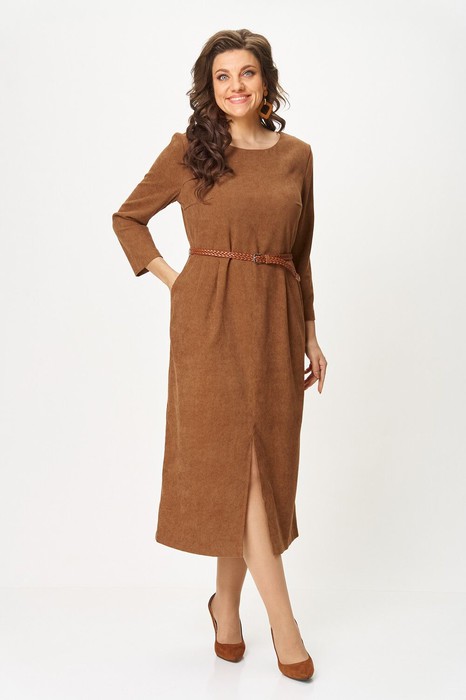 Платье женское из вельвета полуприлегающего силуэта с втачным рукавом. Перед платья с горизонтальным швом по талии. Верхняя часть с вытачками по линии груди, нижняя часть со складками в области талии и карманами что обеспечивает прекрасную посадку и подчеркивает фигуру. Разрез по переду платья добавляет нотку игривости и удобства. В комплекте съемный ремень.