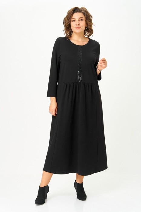 Платье женское свободного силуэта из трикотажного полотна. Модель длины - миди с изящной драпировкой по переду, с втачным рукавом длиной7/8. Горловина округлая. Верхняя часть переда украшена декоративной планкой с пайетками. Спинка цельная. В боковых швах обработаны карманы.
