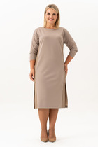 Платье женское прямого силуэта длины миди, с втачным рукавом. Горловина с цельнокроеным воротником стойкой. По горловине и талии вытачки. По переду декоративная планка. Рукав длинный с декоративной планкой из пайеток. По спинке средний шов и потайная застежка молния. В левом боковом шве разрез.