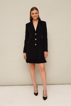 Платье из мягкой вискозной ткани (плательный креп турецкого производства) прямого силуэта. По переду обработаны нагрудные выточки, спинка цельнокроеная. В боковых швах обработаны карманы, по низу боковых швов – разрезы.  Рукав втачной одношовный, со сборкой по шву притачивания манжеты. По низу рукава обработана широкая манжета 10,5 см, застёгивающаяся на 4 пробивные петли и  4 декоративные пуговицы.