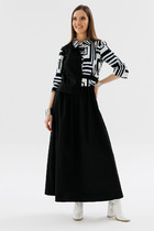 Платье А-силуэта, отрезное по линии талии. Платье - из струящейся принтованной плательной ткани. Перед лифа со средним швом и отложным цельнокроеным воротничком, выполненным из контрастной однотонной хлопковой ткани. По переду и спинке лифа расположены рельефы. В среднем шве спинки предусмотрена молния. Рукав втачной короткий формы «тюльпан».