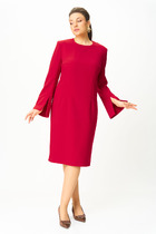Платье прямого силуэта со спущенной линией плеча, скомбинировано из двух видов трикотажных полотен. Перед с косыми подрезами и смещённой от линии центра притачной планкой с декоративными пуговицами. В области бедра расположен накладной карман с функционирующей декоративной молнией. Спинка со средним швом. Пройма спущена, рукав длиной 7/8, горловина круглая.