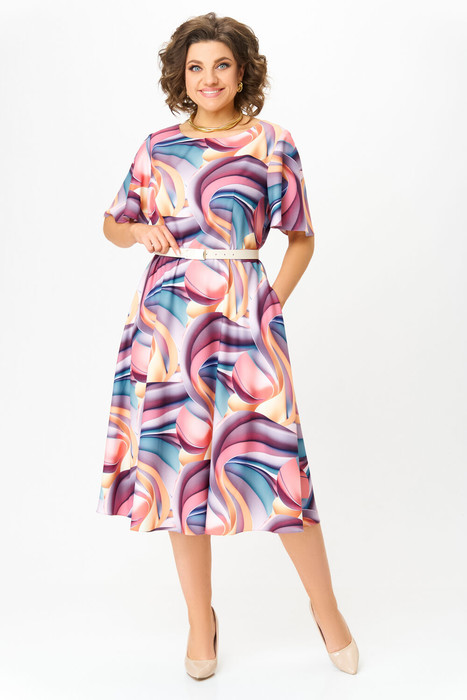 Платье из мягкой вискозной ткани, X-образного силуэта, отрезное по линии талии. Перед лифа с талиевыми вытачками, спинка лифа с центральным швом и талиевыми вытачками. Юбка расклешённая с карманами в боковых швах. Горловина округлой формы. Рукав втачной, короткий, формы «колокол».