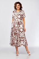 Платье из мягкой вискозной ткани, отрезное по линии талии с полуприлегающим лифом и юбкой А-силуэта, с центральной застёжкой на петли и декоративные пуговицы. Полочка с вертикальными рельефами, спинка с кокеткой и отрезными бочками. Юбка состоит из семи клиньев. По переду между швами обработан карман с планкой на косую. Воротник отложной рубашечного типа, с отрезной стойкой. Рукав втачной короткий, по низу с отложной манжетой.
