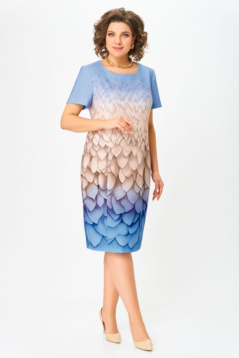Платье полуприлегающего силуэта из мягкой поливискозной ткани с оригинальным дизайнерским принтом. По полочке выполнены рельефные швы, по спинке рельефные швы, средний шов со шлицей и застёжкой на потайную тесьму-молнию. Горловина круглая, обработана обтачкой. Рукав втачной, короткий.