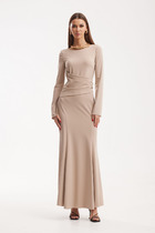 Платье из креп-шифоновой ткани, на трикотажной подкладке, отрезное по линии талии, шов собран на эластичную тесьму-резинку. Горловина округлой формы, по переду капелька с завязкой. Рукав втачной одношовный, внизу со сборкой и манжетой, которая застёгивается на 2 петли и пуговицы.