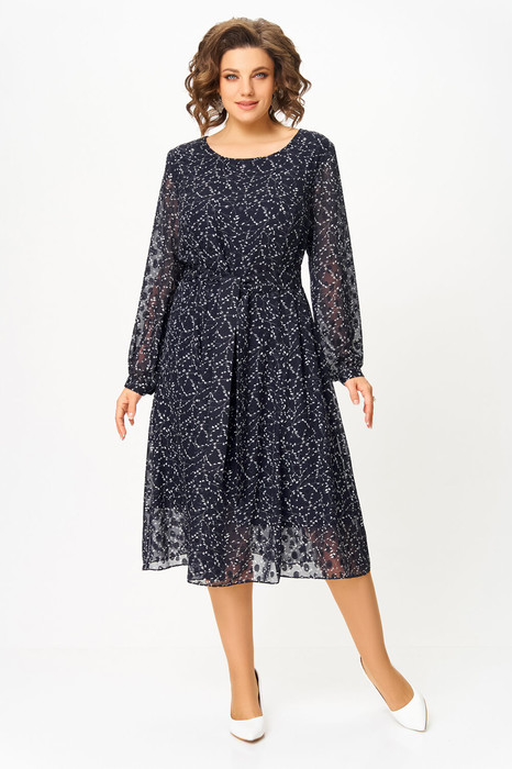 Платье полуприлегающего силуэта из фактурной шифоновой ткани с тиснёным узором на трикотажной подкладке. Полочка с отрезными рельефами, спинка с центральным швом и рельефами. Горловина округлой формы. Рукав втачной, длинный внизу со сборкой и манжетой, которая застёгивается на петлю и пуговицу.