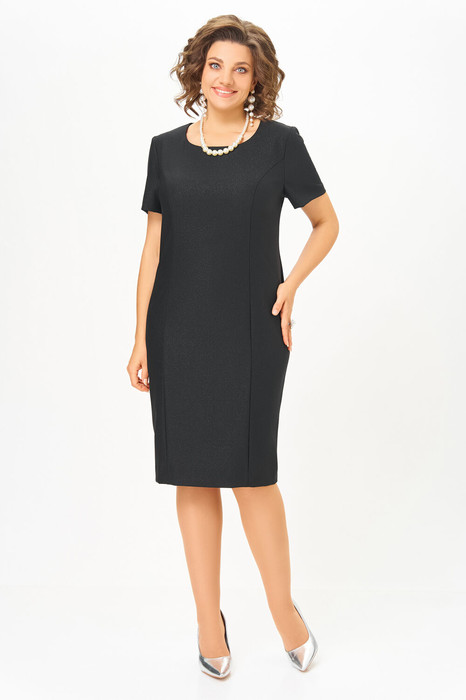 Платье полуприлегающего силуэта из  поливискозной ткани с мягким блеском. По полочке выполнены рельефные швы, по спинке рельефные швы, средний шов со шлицей и застёжка на потайную тесьму-молнию. Горловина круглая, обработана обтачкой. Рукав втачной, короткий.