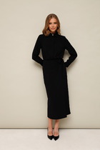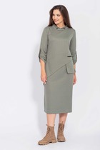 Платье женское, А силуэта, с втачным рукавом, длинной 3/4. Рукав расширенный к низу с разрезом по шву. Разрез зафиксирован на навесную петлю и отделочную пуговицу. Вырез горловины фигурной формы. Перед задекорирован вышивкой из паеток. По спинке средний шов и талевые вытачки. Застежка на потайную тесьму "молния" в среднем шве.