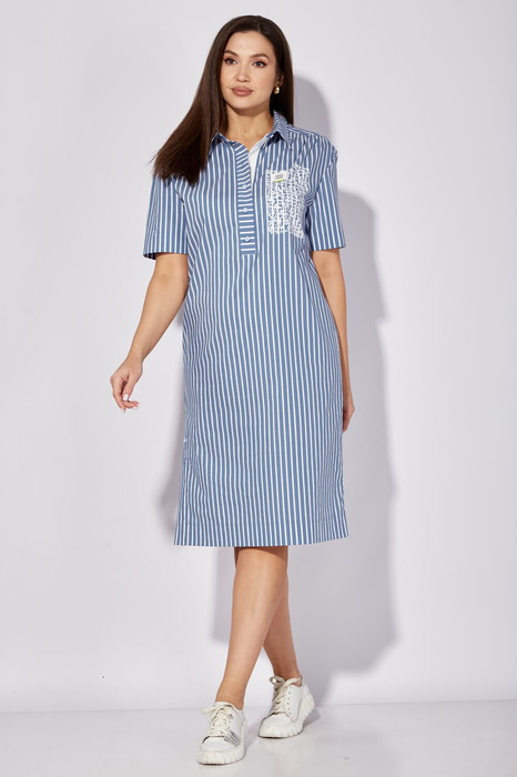 Платье женское, прямого силуэта с коротким рукавом. Рукав со спущенной линией плеча. Воротник рубашейчный, на стойке. Застежка до линии талии, с отрезной планкой на петли и пуговицы. Из под кокеток переда и спинки-сборка. По боку платья, шлица. Перед задекорирован принтом с акцентной нашивкой.