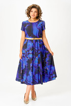 Платье женское, прямого силуэта, с цельнокройным рукавом, длинной 7/8.По переду ассиметричный, фигурный подрез , оформлен воланом и отделочной тесьмой. По спинке средний шов. Вырез горловины круглой формы с тонкой, подрезной бейкой.