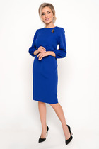 Платье женское полуприлегающего силуэта, расклешенное к низу. По переду наклонные вытачки и рельефы. По спинке талевые вытачки, подрез чуть ниже линии талии и кокетка овальной формы с разрезом и отделочной нашивкой по горловине. Горловина круглой формы. Рукав втачной, длинной 3/4 со сборкой сверху. Низ рукава присобран на манжету. Рукава и кокетка спинки выполнены из отделочной ткани(прозрачная органза с рисунком)