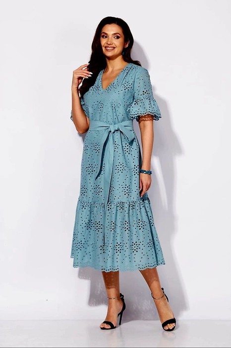 Платье женское, расширенное к низу, А образного силуэта, втачного покроя. Платье выполненоиз кружевного полотна на подкладке. Рукава до локтя с воланои по шву притачивания, по низу с каймой. По переду V образная горловина, кокетка переходящая на спинку, в швах в швах притачивания которой расположена сборка. По спинке кокетка. Низ платья оформлен воланом со сборкой и фигурной каймой. К платью прилагается пояс.