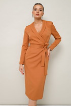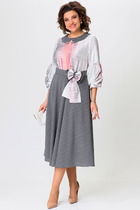 Платье женское, А силуэта, с рукавом длинной 3/4. Рукав втачной, со сборкой по окату, и мягкими складками по низу. По переду нагрудные вытачки. Вырез горловины круглой формы. Карманы накладные, акцентированы стилизированным цветком с декором. По спинке средний шов с отделочной нашивкой сверху.
