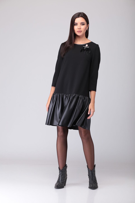 Платье свободного силуэта с притачным воланом снизу. Рукав длинный. Платье украшено съемной брошью. Горловина круглая, обработана притачной бейкой из тафты. Платье выполнено из стрейчевого крепа, пришивной волан из тафты. Длина платья 96 см. Длина рукава 49 см.
