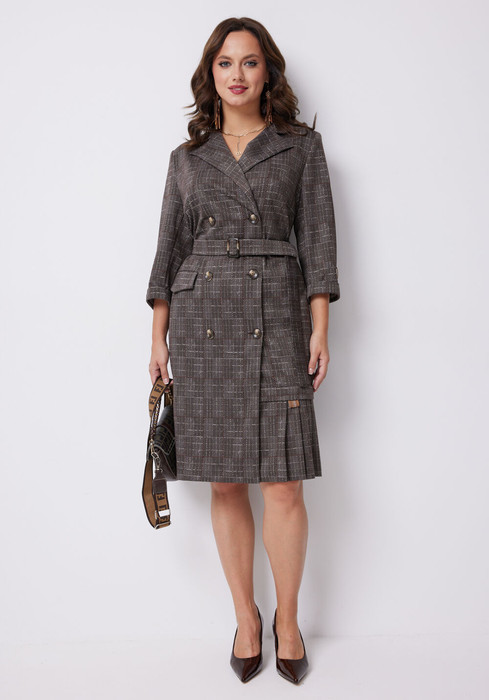 Платье женское полуприлегающего силуэта, выполненное из трикотажа. Платье с двухбортной застежкой на петли-пуговицы. Горловина оформлена воротником пиджачного типа. Рукава двушовные, длиной 3/4, по низу обработаны притачной манжетой. По спинке - средний шов и талиевые выточки. По переду расположены нагрудные выточки. В левой боковой части переда вставлена отделочная деталь со складками, направленными к центру, над которой горизонтально расположена пата. В комплект к платью входит пояс из основной ткани с декоративной пряжкой, в цвет фурнитуры.