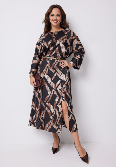 Стильное платье А-силуэта, выполненное из вискозы с оригинальным принтом. Платье отрезное по линии талии. Верхняя часть переда платья с круглой горловиной, спинка - со средним швом и капелькой, застегивающейся на навесную петлю и пуговицу. Рукав цельнокроенный, длиной 7/8. Нижняя часть платья покроя полусолнце. На одной из сторон юбки переда обработана отделочная планка с декоративными пуговицами, внизу - разрез. В боковых швах в области бедер обработаны карманы. В центральной части переда в области талии - притачной пояс со съемной декоративной цепью, которая изящно подчеркивает линию талии. По боковым швам и спинке пояса вставлена широкая резинка.