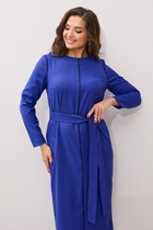 Платье прилегающего силуэта, длиной миди, выполненное из плательной поливискозы. Платье жакетного типа с ассиметричным передом. Одна из сторон переда имитирует жакет и юбку, другая-платье. Перед с талиевыми вытачками с подрезом. В области груди настрочена декоративная листочка, в области бедер - карманы-обманки с листочками и клапаном. По переду обработан разрез. В области талии расположена застёжка на 2 петли и крупные декоративные пуговицы. Спинка со средним швом, в который вставлена потайная молния. Рукав 2-х шовный втачной, длиной 3/4.