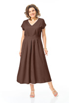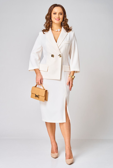 Платье прилегающего силуэта, длиной миди, выполненное из плательной поливискозы. Платье жакетного типа с ассиметричным передом. Одна из сторон переда имитирует жакет и юбку, другая-платье. Перед с талиевыми вытачками с подрезом. В области груди настрочена декоративная листочка, в области бедер - карманы-обманки с листочками и клапаном. По переду обработан разрез. В области талии расположена застёжка на 2 петли и крупные декоративные пуговицы. Спинка со средним швом, в который вставлена потайная молния. Рукав 2-х шовный втачной, длиной 3/4.