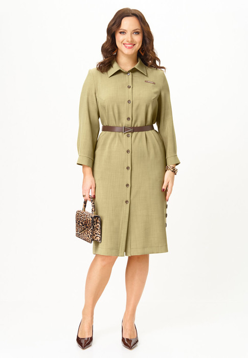 Платье-рубашка полуприлегающего силуэта, длиной миди, выполненое из поливискозы. Перед с нагрудными вытачками и центральной застёжкой на петли и пуговицы на притачной планке. В области груди расположена декоративная нашивка. Горловина обработана воротником рубашечного типа. Спинка цельнокроеная с талиевыми вытачками. Рукав втачной, длиной 3/4, с притачной манжетой, застегивающейся на петлю и пуговицу. В нижней части боковых швов обработаны шлицы, которые застегиваются на петли и пуговицы. В боковых швах в области бедер обработаны карманы. В комплекте ремень.