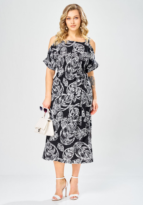 Сарафан женский прямого силуэта на широких бретелях. Выполнен из хлопчатобумажной плательной ткани с растительным принтом. Сарафан с открытой линией плеч и цельнокроенным рукавом до линии локтя. Низ рукава обработан притачной манжетой. Перед сарафана с нагрудными вытачками. Спинка цельнокроенная. По линии талии обработана планка с эластичной резинкой. На планке расположен декоративный пояс, завязывающийся на бант. В области бедер в боковых швах обработаны карманы. В нижней части боковых швов сарафана обработаны разрезы.
