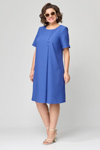 Платье женское полуприлегающего силуэта длиной мидакси. Платье с круглой горловиной и со спущенной линией плеча. Нижняя часть плеча, переходящая в цельнокроенный короткий рукав, обработана притачной манжетой. На верхней части переда платья обработаны нагрудные вытачки. Платье с центральной застёжкой на петли и натуральные пуговицы, на притачной планке, обработанной до линии талии. Верхняя часть спинки цельнокроенная. Нижняя часть переда и спинки цельнокроенные. В боковых швах, в области бедер обработаны карманы. По линии талии расположена эластичная резинка, регулирующая прилегание. В комплект к платью входит плетёный декоративный ремень.