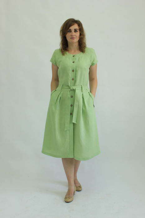 Платье приталенное, отрезное по линии талии. По лифу рельефы. Юбка спереди со встречными складками, карманами с декоративным клапаном. По горловине кокетка. Короткий рукав – реглан со складкой. Мягкий декоративный пояс фиксируется шлёвками. Сквозная застёжка с планками. Длина изделия 115 см.