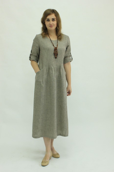 Платье свободного кроя, отрезное по линии груди. По переду защипы и рельефы с карманами. Рукав Вѕ , длина регулируется хлястиком, застёгивающимся на пуговицу. Спинка приталена вытачками, в среднем шве молния. Длина изделия 130 см.