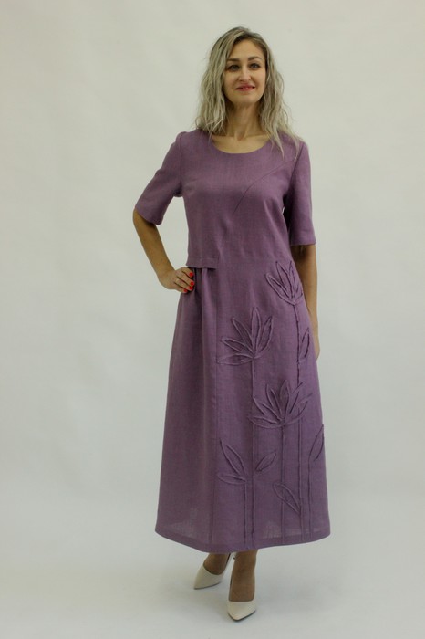 Платье свободного кроя с коротким рукавом. По переду ассиметричные подрезы. Левая сторона с декоративной настрочкой. На правой полочке по линии подреза сборка и планка. Длина изделия 129 см.