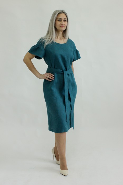 Платье прямое с поясом. По переду рельефы. В среднем шве спинки молния, в низу разрез. Рукав реглан с воланом. Длина изделия 108 см.
